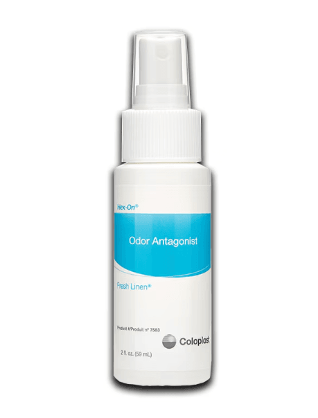 Coloplast Hex-On: Odour antagonist. Non-aerosol spray. Light, mild scent. Controls airborne odours. Fresh linen scent