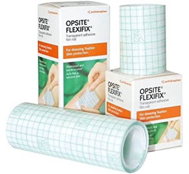 Flexible, transparent acrylic adhesive film for stabilizing primary wound coverings and securing medical devices in precise positioning.