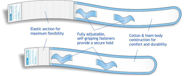 Adjustable velcro fasteners for secure fit. Elastic sections provide comfort and ease of use. Compatible with most disposable vinyl leg bags, replacing traditional latex straps.